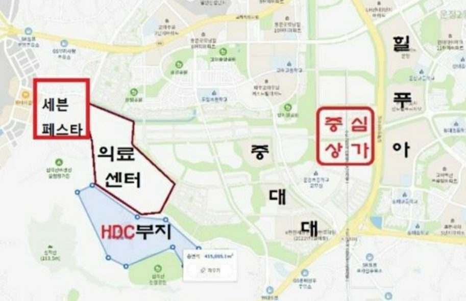 우측으로는 GTX 역 및 중심상가가 존재하고, 좌측으로는 세븐페스타, 의료복합센터, 향후 개발 예정인 HDC 부지, 심학산도 있기에 어찌 보면 3 지구 내 GTX 역사가 지어지기에 향후 3 지구의 발전 가능성은 무궁무진하다.