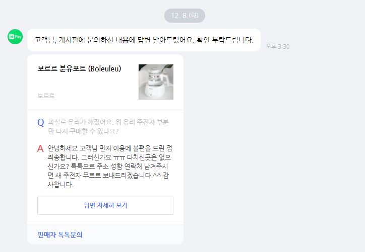 제 잘못이라 ㅜ 새로 사야하나, 중고로 구매할까 고민하던 찰라 고객문의로 주전자 부분만 구매 가능한지 물어보았다.