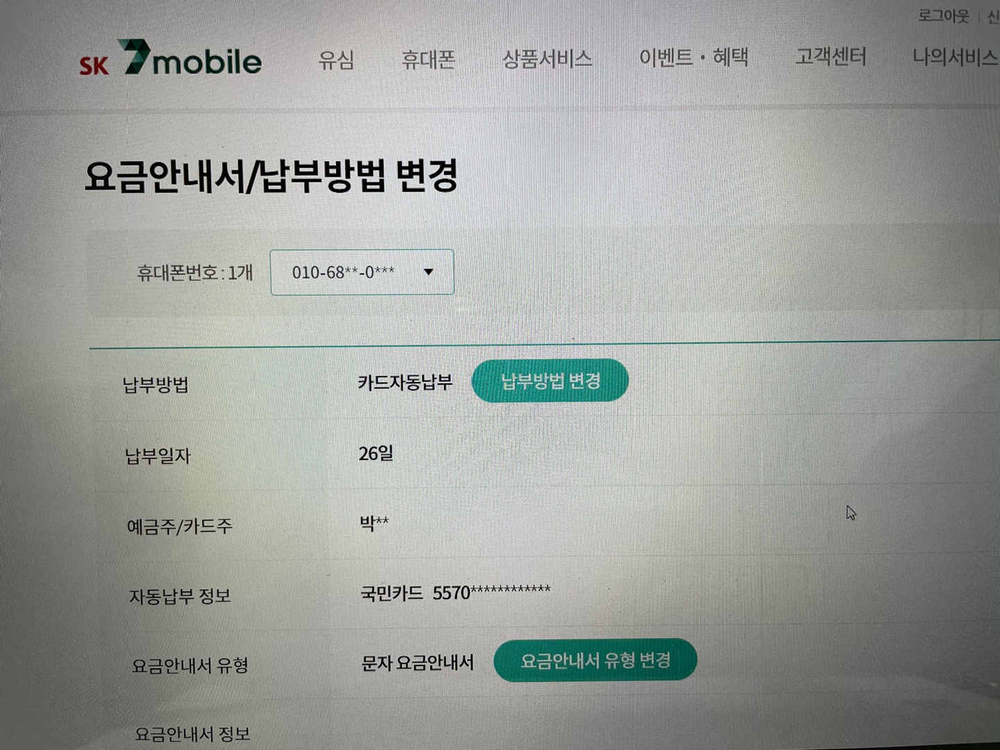 홈페이지에서 요금 자동납부를 해당 카드로 변경해줘야 한다.