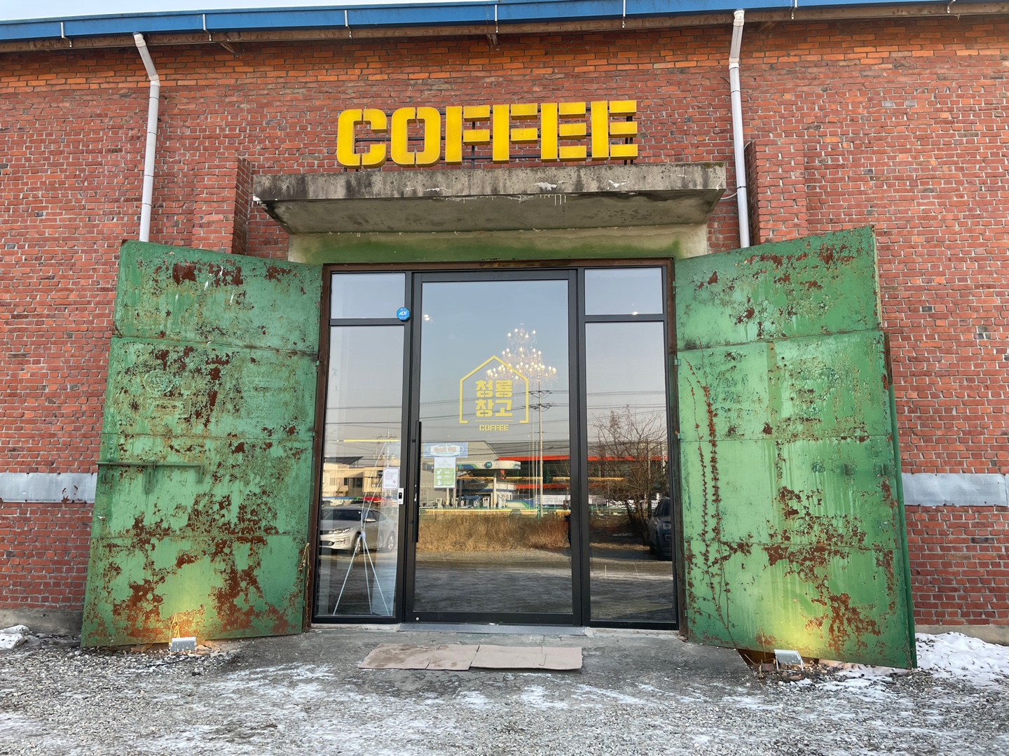 인스타에 올라온 카페 사진을 하나 보았다. 세종에 사는 사람이 올린 사진인데, 뭔가 힙한 느낌?!? 눈도장을 찍고 공주에 가면 시간내서 꼭 가봐야겠다고 생각한 카페가 있었다. 그건 바로 공주 의당에 의치한 창고형카페 "청룡창고카페" 공주에 이런 힙한 창고형 카페가 있다니 공주에 내려온 김에 차를 끌고 바로 향했다. 무엇보다 넓은 주차장이 마음에 든다. 창고형 카페들이 위치한 곳은 대부분 차로 오기 때문에 주차장이 넓어야 한다. 평일 낮에 도착. 원래 진짜 창고를 개조해서 만든 커피전문점이기에 녹슨 현관문 입구가 눈에 사로잡힌다. 노란 "COFFEE" 간판도 어색하지 않게 자리잡았다. 괜히 안어울리게 상호명이 써있는 것보다 나은듯 ?? 실내 파노라마뷰. 보통 창고형 카페는 시끌벅적한 느낌인데 코로나여서 그..